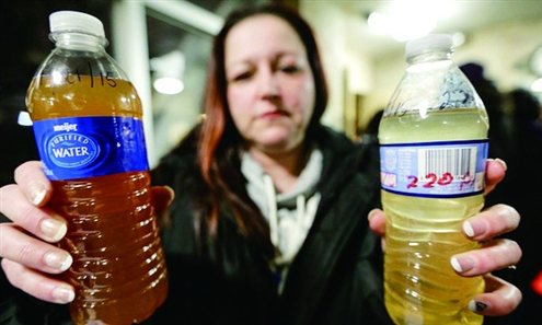 弗林特水危機(jī)期間一名市民展示受嚴(yán)重污染的飲用水