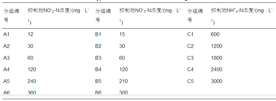 在100 mL血清瓶中加入60 mL配水,pH穩(wěn)定在7.3±0.3,分別向3組血清瓶中加入一定量的NaNO2、NaNO3和NH4Cl貯備液,具體抑制物質(zhì)及濃度情況見表 1.加入40 mL厭氧顆粒污泥,使用高純氮氣吹脫約5 min去除血清瓶中的溶解氧,密封后置于35 ℃恒溫水浴振蕩器中進行培養(yǎng),每個濃度梯度設(shè)3個平行.