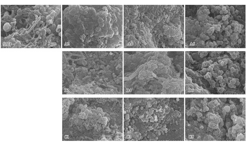 根據(jù)3.1節(jié)中的COD去除率變化選擇具有代表性的濃度組(A組:A2、A4、A6;B組:B2、B4、B6;C組:C1、C3、C5)進行各項指標的測定.圖 2為放大10000倍后的顆粒污泥的掃描電鏡圖.由圖 2可見,空白組厭氧顆粒污泥表面幾乎為8~25 μm長的桿狀菌,伴隨有少量的球菌,污泥表面凹凸不平孔隙交錯,是內(nèi)部微生物能量代謝的重要通道.在高濃度的亞硝氮、硝氮和氨氮(A6、B6和C5)作用下,厭氧顆粒污泥的表面結(jié)構(gòu)都發(fā)生明顯變化,污泥表面的主要細菌由桿狀菌變?yōu)榍驙罹?,幾乎不見桿菌.低濃度抑制作用下,污泥表面主要細菌為桿菌和球狀菌,且與空白組相比桿菌比例明顯降低.