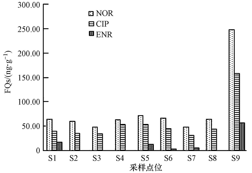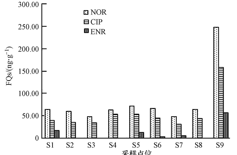 從圖 1可見,9個(gè)采樣點(diǎn)均可檢測(cè)到NOR和CIP,S2、S3、S4、S8均未檢測(cè)到ENR.各樣點(diǎn)FQs含量均為NOR>CIP>ENR.S9的FQs含量最高,NOR含量最高為248.25 ng · g-1,CIP最高為158.69 ng · g-1,ENR最高為56.81 ng · g-1.