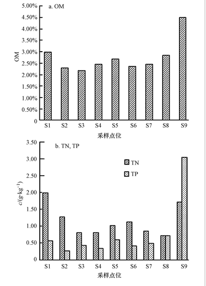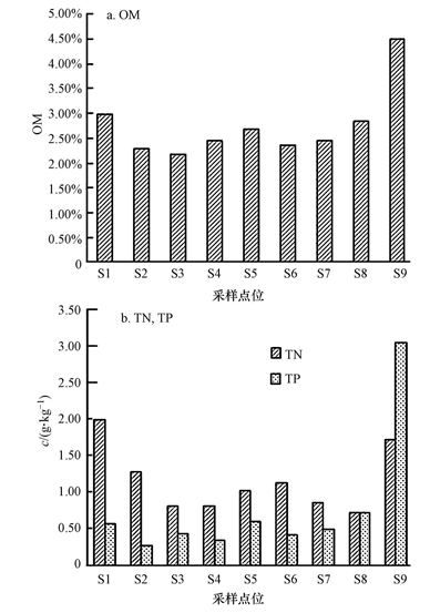 各樣點(diǎn)OM含量變化范圍在0.955%~5.598%,S9測(cè)得最大值為4.51%,差異極顯著(p<0.01).各樣點(diǎn)TN含量變化范圍在0.59~1.73 g · kg-1,平均值為1.15 g · kg-1,差異極顯著(p<0.01).各樣點(diǎn)TP含量變化范圍在0.27~3.06 g · kg-1,平均值為0.77 g · kg-1,有顯著差異(p<0.05).