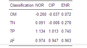 對(duì)NOR、CIP及NOR含量與OM、TN、TP進(jìn)行多元線性回歸分析(見表 2),sig均小于0.001,R2在0.947~0.974間,回歸方程有效,回歸模型與實(shí)驗(yàn)得到的數(shù)據(jù)均吻合較好.從多元回歸分析中得出NOR、CIP及NOR含量主要取決于TP的含量(表 2).