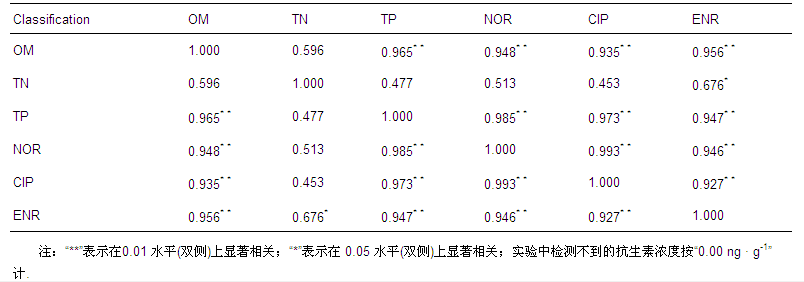 對(duì)FQs與沉積物性質(zhì)進(jìn)行Person相關(guān)性分析(表 1),NOR與OM、TP相關(guān)性極顯著,相關(guān)系數(shù)(r)分別為0.948、0.985(p<0.01);CIP與OM、TP相關(guān)性極顯著,r分別為0.935、0.973(p<0.01);ENR與OM、TP相關(guān)性極顯著,r分別為0.956、0.947(p<0.01),與TN相關(guān)性顯著,r為0.676(p<0.05).NOR、CIP與ENR之間相關(guān)性極顯著,r最小為0.927(p<0.01).