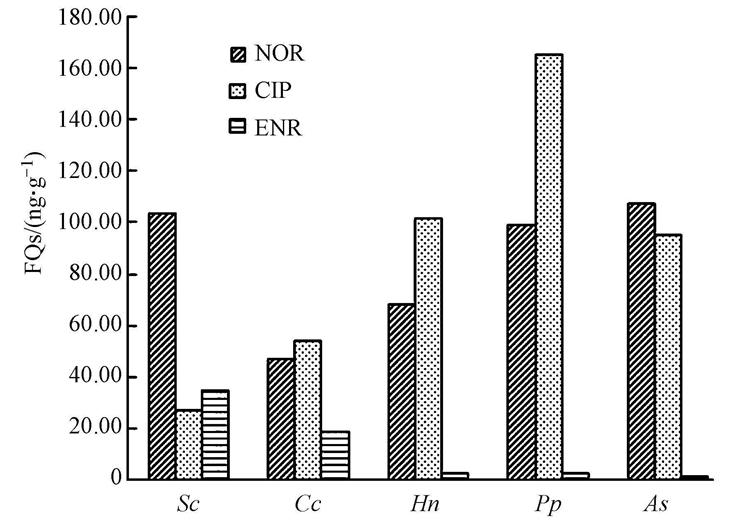 從圖 3可見,5種魚肉中均檢測(cè)出了NOR、CIP、ENR的存在.Cc、Hn和Pp魚肉中檢測(cè)到CIP>NOR>ENR,As、Sc魚肉中檢測(cè)到NOR>CIP>ENR,5種魚肉中ENR的含量相對(duì)低于NOR及CIP的含量.As魚肉中NOR含量最高為106.85 ng · g-1,Pp魚肉CIP含量最高為165.15 ng · g-1.