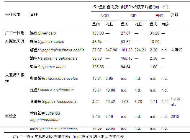本研究測(cè)得5種魚的魚肉中的FQs含量均顯著高于大亞灣大鵬澳和海陵島中魚的FQs的含量;部分魚類魚肉和內(nèi)臟中NOR、CIP含量高于美國(guó)、歐盟的許多國(guó)家的殘留標(biāo)準(zhǔn)(殘留限量為30 ng · g-1),也高于我國(guó)農(nóng)業(yè)部標(biāo)準(zhǔn)NY 5070—2001《無公害食品水產(chǎn)品中漁藥殘留限量》的殘留標(biāo)準(zhǔn)(NOR、CIP殘留限量為50 ng · g-1).分析原因乃為同上,主要是養(yǎng)殖魚塘、禽畜養(yǎng)殖業(yè)、城鎮(zhèn)生活污水及感潮河流的滯留效應(yīng),導(dǎo)致面源污染嚴(yán)重,水體中可能含有較高的FQs含量.Li的研究表明FQs在可食用的軟體動(dòng)物內(nèi)臟中性質(zhì)穩(wěn)定(Li et al., 2012);孫言春的研究也表明FQs在魚體內(nèi)吸收較快,消除較慢,F(xiàn)Qs在魚體內(nèi)富集作用較強(qiáng).魚內(nèi)臟部位為代謝器官,因此,更易積累,造成魚內(nèi)臟中抗生素含量較高的現(xiàn)象.魚體內(nèi)臟中FQs含量多數(shù)情況下高于魚肉中FQs含量,這個(gè)結(jié)果與He的研究結(jié)果一致.
