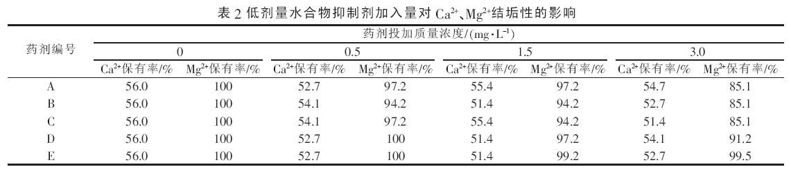 為驗證低劑量水合物抑制劑對油田污水結垢性的影響,按表1 配制強結垢型的油田污水,并添加質量分數為0.5%~3%低劑量水合物抑制劑進行試驗,結果見表2?試驗表明,對于具有較強結垢趨勢的油田水質,加入水合物抑制劑后,Ca2+的保有率比空白稍有下降,但不顯著,即水合物抑制劑的加入對油田污水碳酸鈣垢的沉積不會造成太大的影響?除了E外, 隨著A~D 水合物抑制劑用量增加,Mg2+的保有率有不同程度的下降, 表現出對油田污水中Mg2+的沉積有一定的促進作用?