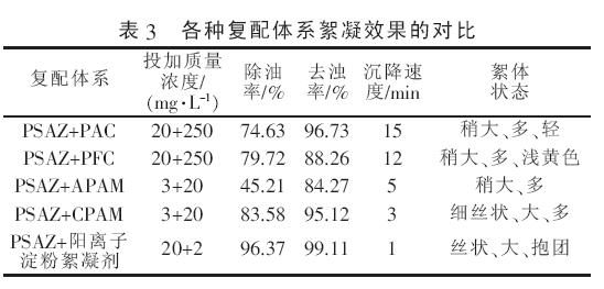 由表2 可知:6 種絮凝劑中,PAC?PFC?APAM?CPAM 對(duì)廢水中油的去除效果較差, 而PSAZ 和陽離子淀粉絮凝劑對(duì)油的去除效果相對(duì)較好?其原因是PSAZ 除了具有單元無機(jī)高分子絮凝劑的共同優(yōu)點(diǎn)外,其異核金屬離子的交錯(cuò)排列能夠形成更長(zhǎng)?更穩(wěn)定的分子鏈,一方面增加了其聚合度和分枝程度,使網(wǎng)捕作用加強(qiáng); 另一方面金屬離子的引入增加了所帶的電荷量,使其吸附電中和能力提高,增加了其處理效果?陽離子淀粉絮凝劑的處理效果雖然次于PSAZ,但其沉淀速度是最快的,這就縮短了處理時(shí)間,提高了處理效率?各種復(fù)配體系絮凝效果的對(duì)比如表3 所示?