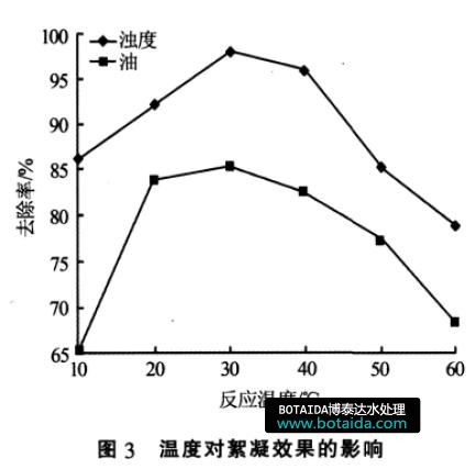 由圖3 可看出,隨著水溫的升高,絮凝效果亦相應(yīng)提高,在水溫為20~40 ℃時(shí),其去除效果最佳;當(dāng)溫度升高到一定程度后,絮凝效果反而降低?究其原因主要是:在較低溫度時(shí),水解反應(yīng)速度緩慢,水的黏度較大,導(dǎo)致膠體顆粒運(yùn)動(dòng)的阻力增大,絮體的生成速度降低,顆粒不易沉降?但水溫過高時(shí),化學(xué)反應(yīng)速度亦加快,所形成之絮體較細(xì)小,同時(shí)絮體的水合作用增加,減緩了絮體的沉降速度,使絮凝效果降低?本試驗(yàn)中室溫在25 ℃左右時(shí),其處理效果最佳?