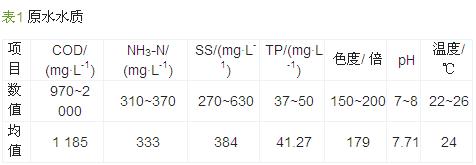 原水來自某生物制藥有限公司,該公司的綜合廢水處理采用“調(diào)節(jié)池+一級水解酸化池+CASS池+二級水解酸化池+接觸氧化池+二沉池”工藝,本試驗用水取自該公司污水處理廠的一級水解酸化池出水,一級水解酸化池的進(jìn)水是經(jīng)過調(diào)節(jié)池和物理處理后的出水。該公司主要生產(chǎn)輔酶Q10,廢水主要污染物為生物發(fā)酵剩余的營養(yǎng)物質(zhì)、生物代謝產(chǎn)物等。原水的水質(zhì)水量變化較大,其成分復(fù)雜,碳氮營養(yǎng)比例失調(diào)(氮源過剩),硫酸鹽和懸浮物含量高,廢水帶有較重的顏色和氣味,易產(chǎn)生泡沫,含有具有抑菌作用的難降解物質(zhì)。原水水質(zhì)情況見表1。