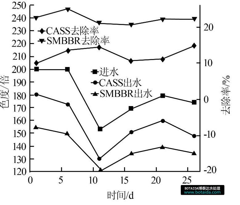 圖5 CASS和SMBBR工藝對色度的去除效果