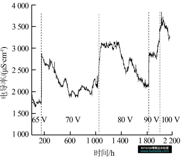 運行電壓隨進水電導(dǎo)率變化趨勢見圖3。
