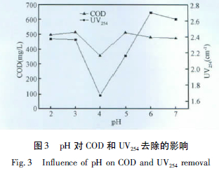 分別量取300 mL 廢水,并分別調(diào)節(jié)廢水pH =2、3、4、5、6、7,然后加入到500 mL 的光化學(xué)反應(yīng)器中,再加入FeSO4·7H2O 顆粒,將光化學(xué)反應(yīng)儀磁力攪拌調(diào)節(jié)到1 000 r /min,開啟磁力攪拌,使其充分溶解均勻,再加入28 mL 的雙氧水,同時(shí)通入臭氧,開啟光化學(xué)反應(yīng)儀反應(yīng)30 min,停止反應(yīng)取樣測定處理后水樣的COD 和UV254,COD 和UV254的降解情況如圖3 所示。由圖3 可以看到,當(dāng)pH=4,廢水的COD 和UV254都是降到最低,分別為357 mg /L 和1.67 cm-1。pH 一直影響是Fenton 反應(yīng)的一個(gè)重要因素,傳統(tǒng)的Fenton 最佳pH 一般在3 左右。這在一定程度上影響了Fenton 法的工業(yè)應(yīng)用,因?yàn)橐獙U水的pH 調(diào)節(jié)到酸性條件下,增加了藥劑成本。由此可知道廢水降解最佳pH=4。