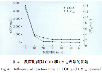2.4 反應(yīng)時(shí)間對廢水COD 和UV254的影響