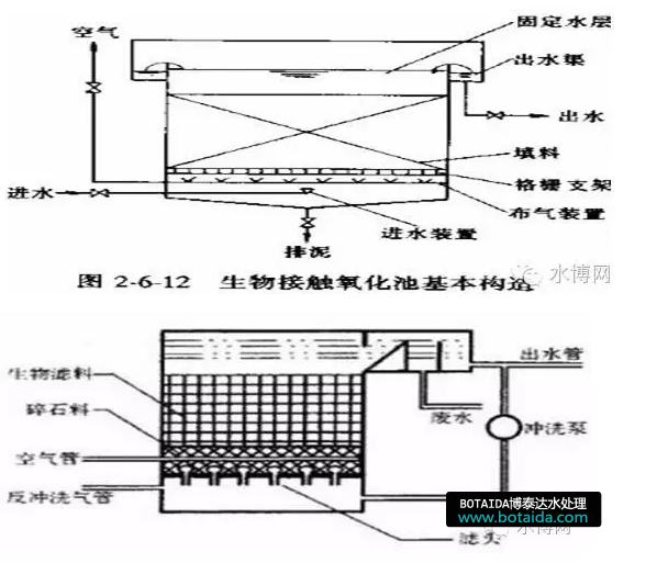 接觸生物法是一種兼有活性污泥法和生物膜法特點的一種新的污水生化處理方法。這種方法主要設(shè)備是生物接觸氧化濾池。在不透氣的曝氣池中裝有焦炭、礫石、塑料蜂窩等填料,填料被水侵沒,用鼓風機在填料底部曝氣充氧。
