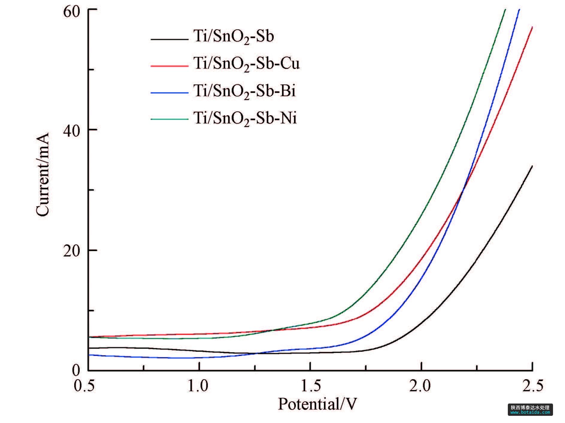 利用CHI 760C電化學工作站測試電極的電化學性能,根據(jù)極化曲線考察摻雜不同金屬對Ti/SnO2-Sb電極析氧電位的影響,用恒電位下的電流-時間曲線反映電極的穩(wěn)定性,以循環(huán)伏安曲線考察電極催化性能.采用三電極體系:制備電極為工作電極、純鈦板為輔助電極、飽和甘汞電極為參比電極,在常溫25 ℃條件下,測定其在0.5 mol · L-1硫酸鈉溶液中的極化曲線,在恒電位(1 V)下測定電流與時間的關(guān)系曲線,并在0.5 mol · L-1 Na2SO4溶液和0.5 mol · L-1 Na2SO4+100 mg · L-1 1,4-二氯苯溶液中對改性Ti/SnO2-Sb電極進行循環(huán)伏安測試.