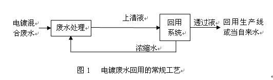 圖1是把所有電鍍廢水混合集中收集,先經(jīng)過物化或生物一系統(tǒng)處理,然后把上清液進(jìn)行膜系統(tǒng)回收,因在廢水處理過程中,投加了大量的PAC、PAM等,藥劑中含有大量的陽離子物質(zhì)存在水中,很容易與回用膜元件表面電荷結(jié)合而堵塞膜元件,更不能保證很高的回收率,通?;厥章首罡邇H能達(dá)到50%,往往并不能保證長期穩(wěn)定的運(yùn)行;因投加了大量的藥劑,使廢水的含鹽量也大大的增加,所以也降低了回用水水質(zhì);通過膜技術(shù)回用后的濃縮水重金屬通常會(huì)超標(biāo),不能直接排放,這樣只能回到廢水前處理系統(tǒng)中,從而增加了廢水處理部分的負(fù)荷及水量,嚴(yán)重影響廢水處理部分的效果,同時(shí)占地及土建投資也增大。