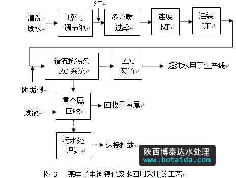工藝說明:清洗廢水主要包括酸性清洗廢水及堿性清洗廢水兩大部分,廢水中主要含有硫酸、硫代硫酸鈉、甲基磺酸、堿性液、銅、錫及添加劑等,混合后的清洗水主要偏酸性,多路清洗廢水匯集于調(diào)節(jié)池,通過曝氣攪拌,使水質(zhì)水量達(dá)到調(diào)節(jié)作用,調(diào)節(jié)后的水進(jìn)入多介質(zhì)過濾系統(tǒng)主要是攔截較大顆粒物及膠體,然后進(jìn)入MF/UF(可選項(xiàng)),主要去除較小懸浮物、膠體、細(xì)菌微生物等,MF/UF具有自動(dòng)運(yùn)行、沖洗功能;MF/UF透過液進(jìn)入膜脫鹽系統(tǒng),主要是脫除水中鹽份,該膜元件是根據(jù)電鍍廢水的特性,采用連續(xù)錯(cuò)流抗污染技術(shù),少量的濃縮水中含有較高的重金屬,先進(jìn)行重金屬回收(若較貴重的重金屬可分開收集單獨(dú)回收重金屬,達(dá)到純度更高的重金屬),再把回收后的廢水供至污水站進(jìn)行物化或生化處理達(dá),最終確保出水水質(zhì)達(dá)到《電鍍污染物排放標(biāo)準(zhǔn)》(GB21900-2008)指標(biāo)。
