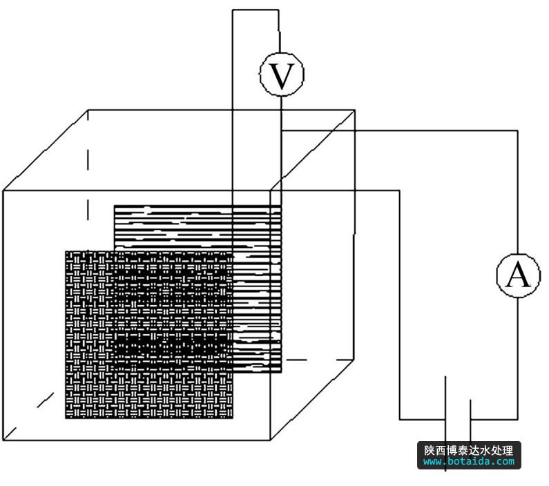 實(shí)驗(yàn)選用Ir-Ta-Sn摻雜電極(購(gòu)自寶雞智銘特種金屬有限公司)作陽(yáng)極,不銹鋼電極作陰極,構(gòu)成電催化降解實(shí)驗(yàn)裝置。裝置尺寸為 160 mm×150 mm×70 mm,外接可調(diào)電源,如圖 1所示。