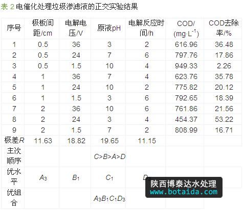 分析表 2發(fā)現(xiàn),原液pH對(duì)降解效果的影響最顯著,其次是電解電壓;各因素對(duì)電催化反應(yīng)的影響順序?yàn)椋涸簆H>電解電壓>極板間距>電催化氧化時(shí)間。