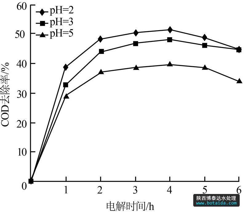 綜上不難發(fā)現(xiàn),當(dāng)滲濾液的pH分別為2、3、5 時(shí),隨電解時(shí)間的延長(zhǎng),COD去除率進(jìn)一步增加,但超過(guò)4 h后去除率基本不變;當(dāng)電解電壓為24、36 V,電解4 h時(shí),COD去除率達(dá)到最大;極板間距為1.5 cm時(shí),電解約4 h COD去除率也達(dá)到最大值。這說(shuō)明采用Ir-Ta-Sn摻雜電極對(duì)垃圾滲濾液進(jìn)行電催化降解時(shí),電解時(shí)間不宜超過(guò)4 h,此時(shí)COD去除率已達(dá)到最大值;電解時(shí)間繼續(xù)延長(zhǎng),垃圾滲濾液中的COD不但不降低,反而會(huì)有一定程度的回升。因此合理控制電化學(xué)氧化時(shí)間,可以減少能耗,并提高COD去除率。