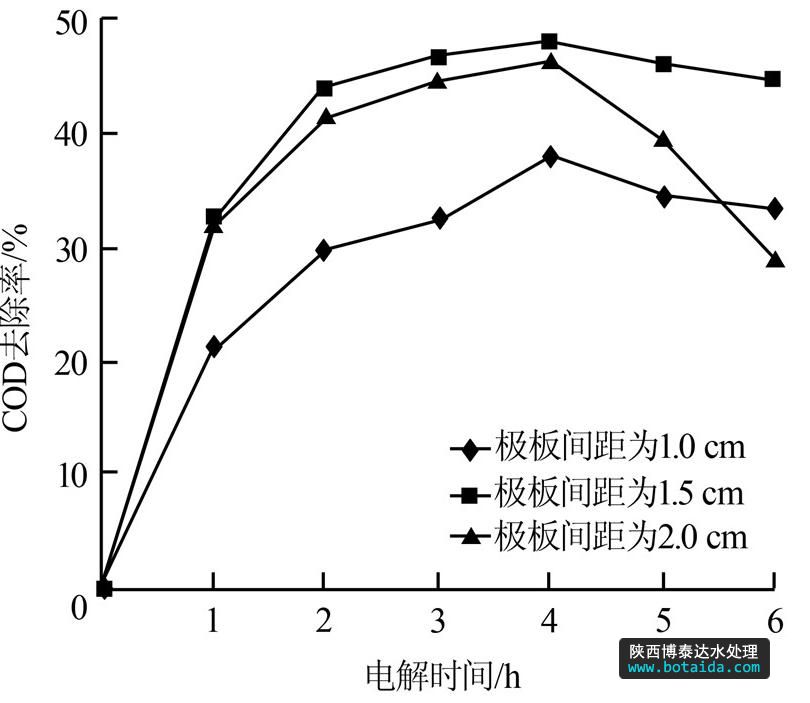 (3)調(diào)節(jié)極板間距至1.5~2.0 cm對(duì)提高垃圾滲濾液的COD去除率有利。過(guò)小的極板間距會(huì)產(chǎn)生短路現(xiàn)象,過(guò)大則會(huì)降低去除效果。