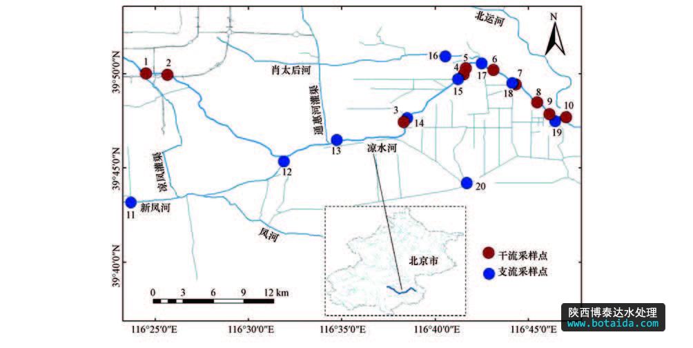 基于涼水河水系空間分布情況和污染源位置,選取涼水河干流上游、下游及主要支流為研究區(qū)域,共設(shè)置20個采樣點(干流10個、支流10個)(圖 1).具體分布如下:1~3號采樣點位于干流上游,4~10號采樣點位于干流下游,11~20號采樣點位于支流.樣品于2014年7月進行采集,用抓斗式采樣器平行3次采集河流表層0~10 cm的沉積物樣品,裝入自封袋并置于車載冰箱中在4 ℃下保存.帶回實驗室后,將樣品充分混勻、冷凍干燥、過100目尼龍篩,然后置于自封袋中密封保存待測.