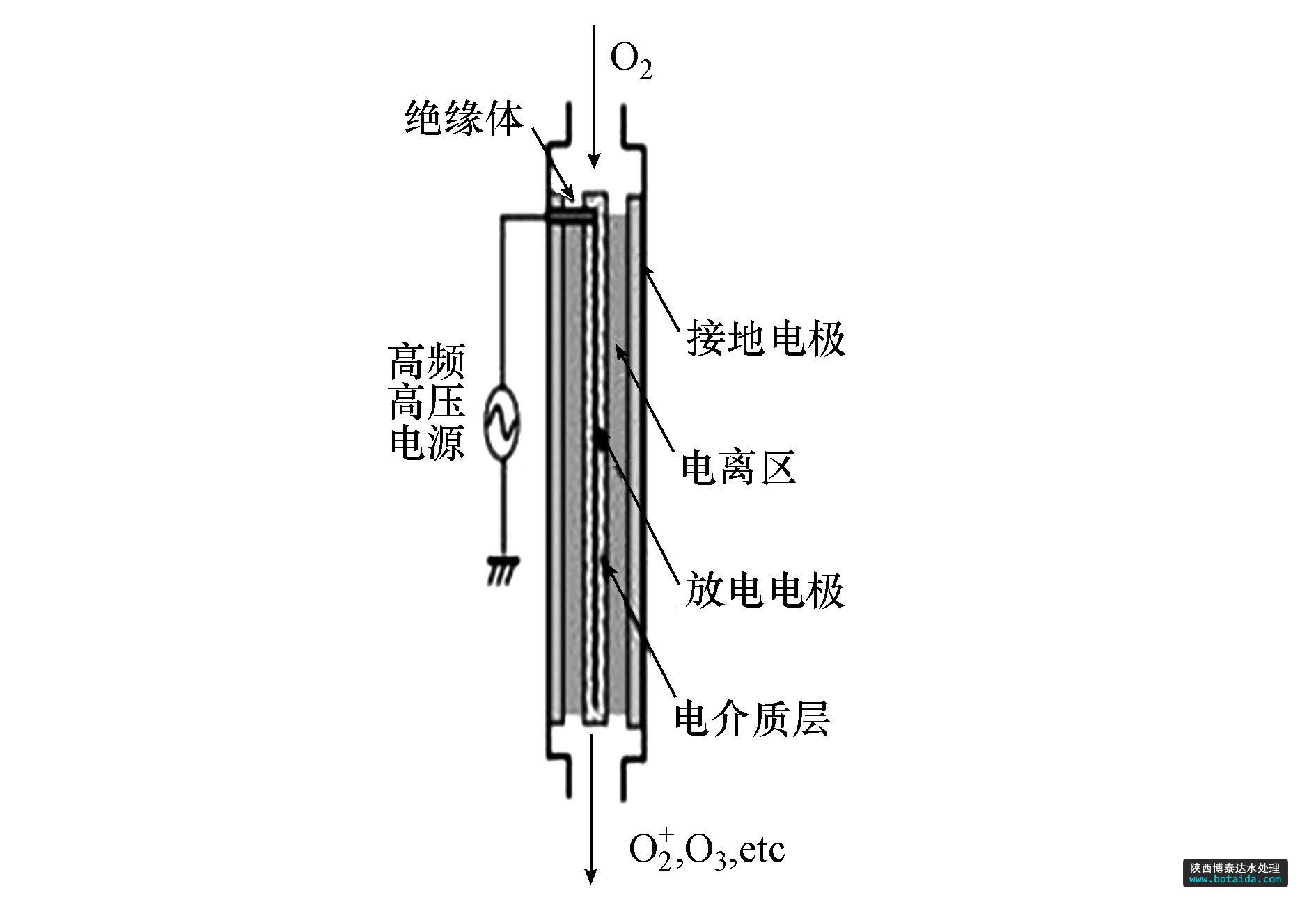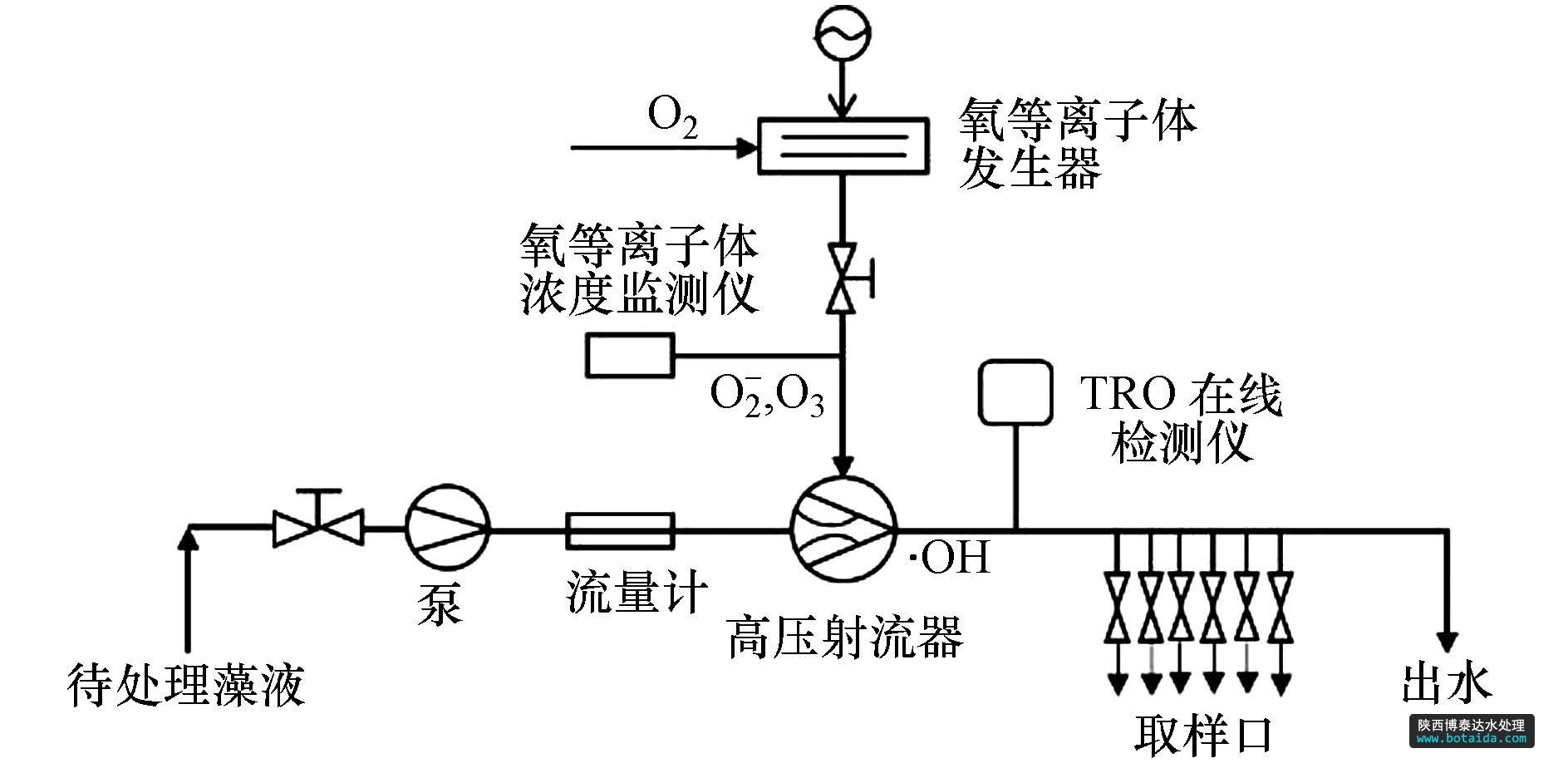 · OH處理高藻水的實驗系統(tǒng)如圖 1所示.待處理藻液由水泵泵入管路,進水流量為4 L · min2-1,純度為99.9%的O2通入氧等離子體發(fā)生器中(圖 2),流量為0.5 L · min-1.在大氣壓下微流注與微輝光交替協(xié)同形成的強電離放電作用下,O2被電離,生成O+、O(21D)、O、O-、O2(a21Δg)、O3等氧活性粒子;然后在高壓射流器處,經射流、空穴作用將氣態(tài)氧活性粒子高效傳質混溶于水溶液中,生成以· OH為主的氧自由基溶液,其中還包括H2O2、HO-、O2· -,