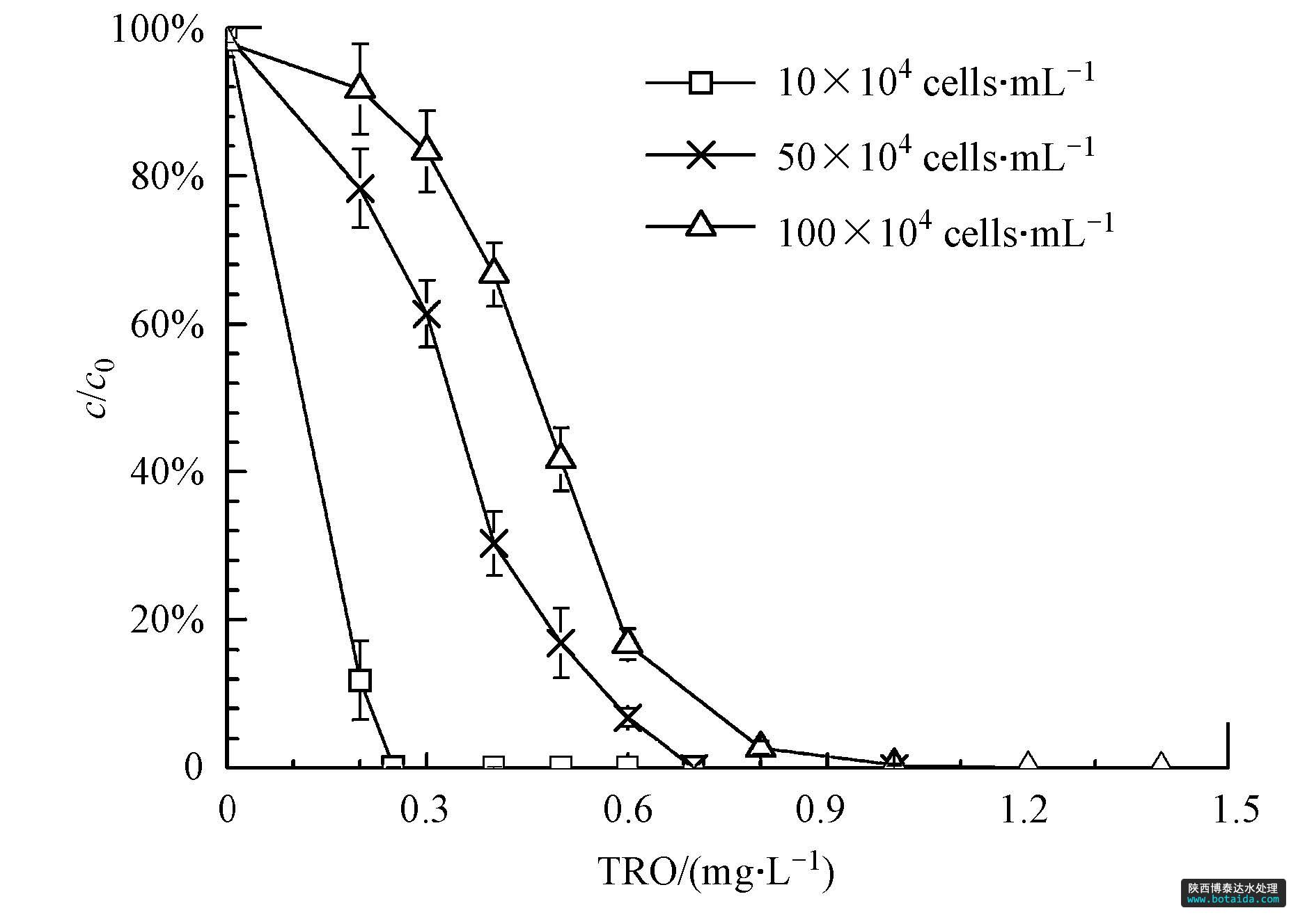 實驗中對初始藻密度分別為10×104、50×104、100×104 cells · mL-1的藻液在實驗系統(tǒng)中進行殺滅.對于某一藻密度的藻液,改變TRO濃度,利用熒光顯微鏡測定藻細胞的存活率(c/c0).得到不同初始藻密度的藻細胞存活率與TRO濃度的關系曲線,如圖 3所示.可看出,隨著TRO濃度的不斷升高,藻細胞存活率隨之降低;在相同的TRO濃度下,藻類的初始濃度越高,存活率越低.因此使不同的初始藻密度的藻細胞完全致死所需的TRO濃度是不同的.隨著藻液初始藻密度的升高,所需要的致死劑量也隨之升高.致死劑量由低到高分別為0.25、0.71、1.18 mg · L-1.
