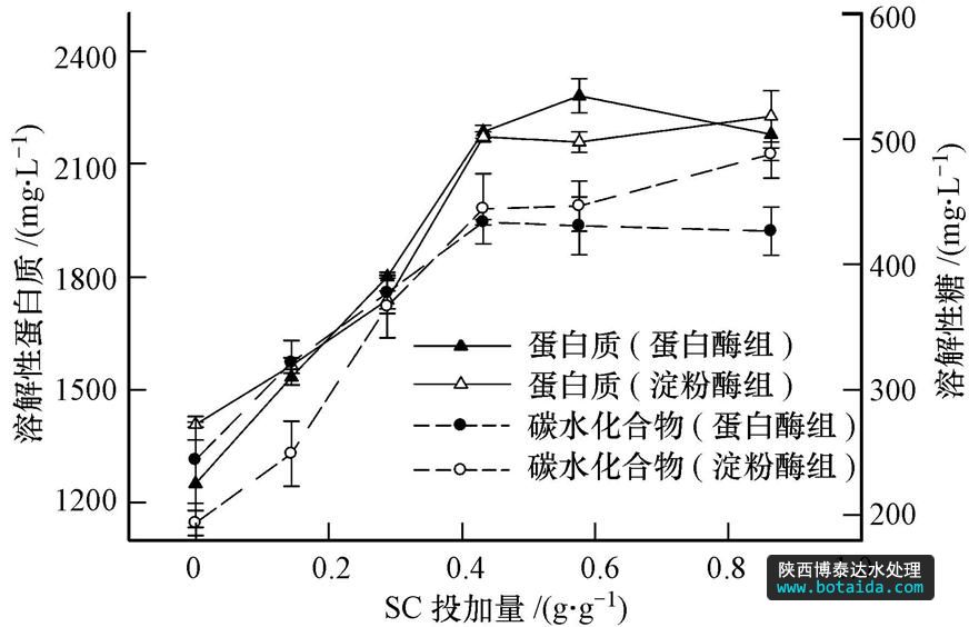 SC的投加量為0~0.432 g · g-1時(shí),溶解性蛋白質(zhì)和碳水化合物的濃度不斷增加,繼續(xù)提高SC的投加量,其濃度僅有小幅度的上升.由此可知,SC投加量達(dá)到一定值后,再通過增加SC的投加量來促進(jìn)污泥水解的作用并不明顯.綜合考慮處理效率和經(jīng)濟(jì)成本,本研究中SC的最佳投加劑量為0.432 g · g-1.