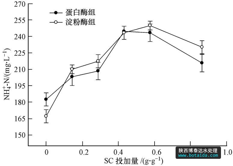 圖 3為反應(yīng)4 h后,污泥中氨氮濃度隨SC投加量的變化情況.在水解酶的催化作用下,污泥中的含氮物質(zhì)——主要為蛋白質(zhì)轉(zhuǎn)化為二肽、氨基酸,氨基酸進(jìn)一步轉(zhuǎn)化為氨(Shanableh et al., .,2001).因此,蛋白質(zhì)不斷溶出的同時(shí),污泥液相中的氨氮濃度也不斷提高.只投加水解酶(不投加SC)時(shí),氨氮濃度由原污泥的60.0 mg · L-1分別增加至182.0 mg · L-1(蛋白酶組)和167.0 mg · L-1(淀粉酶組).當(dāng)SC投加量為0.432 g · g-1時(shí),氨氮濃度分別增加至245.0 mg · L-1(蛋白酶組)和243.0 mg · L-1(淀粉酶組).蛋白質(zhì)和碳水化合物是剩余污泥的主要組成成分,脂肪含量很少,基本可以忽略.蛋白質(zhì)的可生化降解性較差,其水解在污泥消化過程中是限速步驟,決定了此過程中有機(jī)物的降解程度(劉常青等,2008).SC的投加提高了蛋白質(zhì)的降解速率,一方面是由于SC的投加促使更多的蛋白質(zhì)溶解到液相,其降解速率高于固相中的蛋白質(zhì).另一方面,SC的投加破壞了EPS的網(wǎng)絡(luò)結(jié)構(gòu),水解酶得到釋放,從而增加了其與底物的接觸機(jī)會(huì),蛋白質(zhì)的轉(zhuǎn)化效率得到提高.