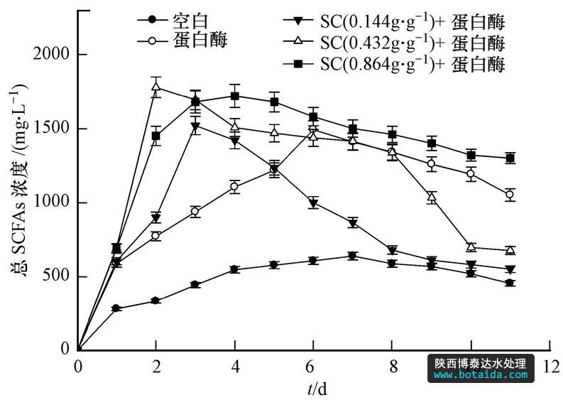 SC對(duì)污泥產(chǎn)酸影響:設(shè)立4組實(shí)驗(yàn),各組均取400 mL污泥,先投加蛋白酶0.06 g · g-1,SC以粉末形式投加,每組SC的投加量分別為0、0.144、0.432、0.864 g · g-1,隨后向各錐形瓶中通入氮?dú)饧s4 min以完全驅(qū)除殘留空氣,加塞置于50℃水浴振蕩器上反應(yīng),反應(yīng)裝置在此條件下反應(yīng)12 d,每天對(duì)酸化產(chǎn)物SCFAs進(jìn)行測(cè)定.同時(shí)設(shè)定空白對(duì)照組,除不加酶和SC外,其它條件與實(shí)驗(yàn)組均相同.