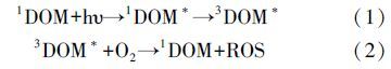 溶解性有機(jī)質(zhì)(DOM)含有發(fā)色基團(tuán),是重要的天然光敏劑,在紫外輻射或太陽(yáng)光照射下,單線態(tài)(state DOM singlet,1DOM)分子吸收光能先轉(zhuǎn)化為激發(fā)單線態(tài)(excited state DOM singlet,1DOM*),進(jìn)而轉(zhuǎn)化為激發(fā)三線態(tài)(excited state DOM triplets,3DOM*),進(jìn)一步與溶解氧分子發(fā)生一系列反應(yīng),產(chǎn)生活性氧物質(zhì)(reactive oxygen species,ROS),如羥基自由基(hydroxyl radical,· OH)、單線態(tài)氧(singlet oxygen,1O2)、超氧化物(superoxide,O2-)等(見反應(yīng)式(1)、(2.這些活性氧物質(zhì)可以誘導(dǎo)有機(jī)污染物光降解,同時(shí),DOM也會(huì)與目標(biāo)化合物競(jìng)爭(zhēng)光吸收,或猝滅目標(biāo)化合物的激發(fā)態(tài),DOM對(duì)有機(jī)污染物的光解具有光敏化和光屏蔽雙重作用(Chen et al., 2009;,這與DOM的來(lái)源、組成、化學(xué)結(jié)構(gòu)等特點(diǎn)密切相關(guān).因此,溶解性有機(jī)質(zhì)在水生生態(tài)系統(tǒng)光化學(xué)中扮演重要角色,可以影響有機(jī)污染物的環(huán)境行為和生態(tài)風(fēng)險(xiǎn).