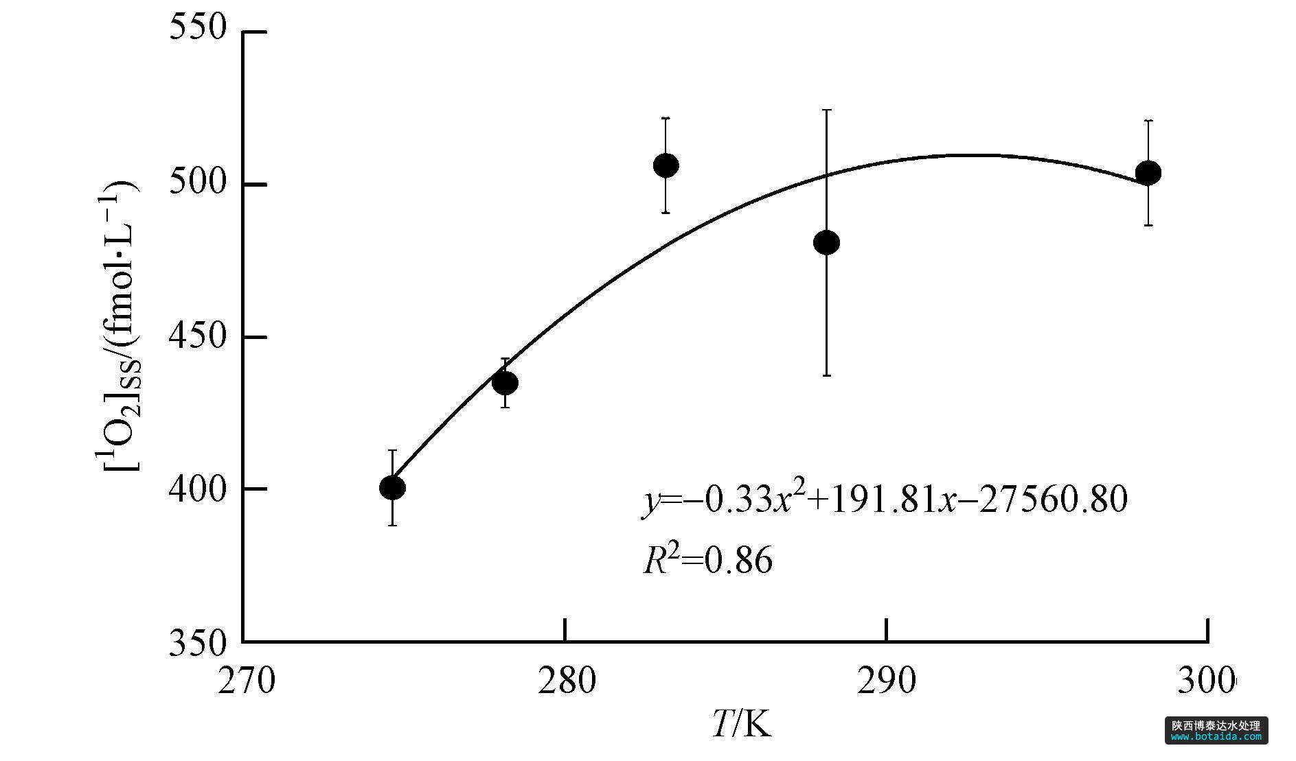 為模擬實(shí)際水環(huán)境,本研究所選溫度段為1.5、5、10、15和25 ℃,[1O2]ss與T(T為絕對(duì)溫度)的關(guān)系如圖 4所示.實(shí)驗(yàn)溫度范圍內(nèi),[1O2]ss值為400~506 fmol · L-1,隨T增大呈增長(zhǎng)趨勢(shì).分析推測(cè)溫度升高,溶液中分子活躍度增強(qiáng),使得HA吸收光子能量發(fā)生能級(jí)躍遷生成三線激發(fā)態(tài)(3HA*)的速率增大,使得更多的氧分子獲得3HA*轉(zhuǎn)移的能量形成1O2.