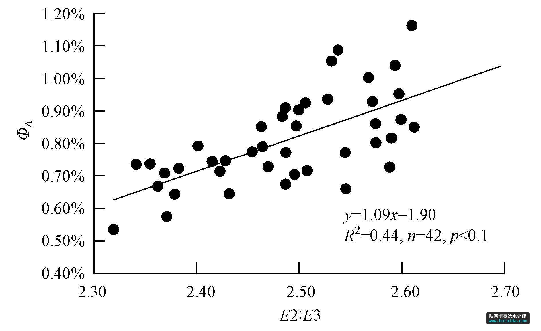 盡管腐殖酸結(jié)構(gòu)、性質(zhì)的復(fù)雜性對(duì)其分子規(guī)模下光化學(xué)模型的建立造成了很大阻礙,但眾多研究表明了用光譜數(shù)據(jù)對(duì)腐殖酸光化學(xué)反應(yīng)速率進(jìn)行預(yù)測(cè)的可能性.例如,一些研究結(jié)果表明:熒光特性指標(biāo)與DOM的平均分子量負(fù)相關(guān)(Coelho et al., 2011),小分子量的HA光敏化降解2,4,6-三甲基苯酚的效率比大分子量的高(Halladja et al., 2007).Dalrymple et al., 2010)用測(cè)定得到的ФΔ與E2:E3的關(guān)系式對(duì)ФΔ進(jìn)行預(yù)測(cè)計(jì)算,結(jié)果與實(shí)際值的誤差為-3%~60%.