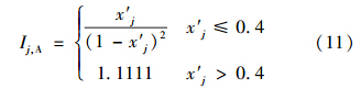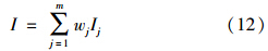 式中,Ij為由式(10)或式(11)計算得到的指標(biāo)j的引力指數(shù)值;wj為指標(biāo)j的歸一化權(quán)值,即滿足∑ m j=1 wj=1,它可以視實際問題需要,采用某種方法確定.一般情況下,只要各指標(biāo)的規(guī)范值x′j差異不大,可視各指標(biāo)為等權(quán)即可;但若最大指標(biāo)規(guī)范值x′j,max與最小指標(biāo)規(guī)范值x′j,min差異較大,則可采用如式(13)所示的對各指標(biāo)規(guī)范值x′j的線性加權(quán)計算權(quán)值.