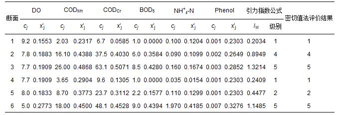 2008年圖們江干流6個斷面的6項地表水水質(zhì)指標(biāo)監(jiān)測數(shù)據(jù)cj(唐立新等,2010),以及由式(1)和式(2)計算得到的指標(biāo)規(guī)范值x′j如表 5所示.對斷面2和3,采用式(13)對引力指數(shù)值進行加權(quán)計算;其余斷面在視指標(biāo)為等權(quán)的情況下,用式(10)和式(12)計算得到各監(jiān)測點水質(zhì)引力綜合指數(shù)值,并根據(jù)表 3中3類陸地水體的引力綜合指數(shù)值的分級標(biāo)準(zhǔn)做出水質(zhì)類別判斷結(jié)果(表 5).表 5中還列出了參考文獻(唐立新等,2010)中用密切值法作出的評價結(jié)果.可以看出,利用引力普適指數(shù)公式和用密切值法對6個斷面水質(zhì)做出的評價結(jié)果,完全一致.
