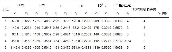 豐縣5個監(jiān)測點的5項地下水指標(biāo)監(jiān)測數(shù)據(jù)cj(劉洪等,2009),以及由式(1)和式(3)計算得到的指標(biāo)規(guī)范值x′j如表 6所示.在視各指標(biāo)為等權(quán)情況下,用式(10)和式(12)計算得到各監(jiān)測點水質(zhì)引力綜合指數(shù)的指數(shù)值,并根據(jù)表 3中3類陸地水體的綜合指數(shù)值分級標(biāo)準(zhǔn)做出水質(zhì)類別判斷結(jié)果(表 6).表中還列出文獻(劉洪等,2009)中用多屬性決策分析法(TOPSIS)做出的評價結(jié)果,可以看出,2種方法做出的評價結(jié)果完全一致.
