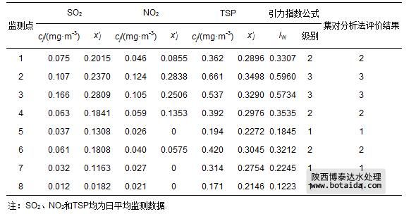 武漢市不同測點的空氣指標(biāo)日平均濃度監(jiān)測數(shù)據(jù)cj(郭紹英等,2009),以及由式(1)和式(6)計算出的指標(biāo)規(guī)范值x′j如表 10所示.在視各指標(biāo)為等權(quán)的情況下,將表 10中的3項指標(biāo)規(guī)范值x′j分別代入式(11)和式(12)所示的引力指數(shù)公式,計算得到武漢市各測點空氣質(zhì)量引力綜合指數(shù)值,并根據(jù)表 3中空氣環(huán)境質(zhì)量綜合指數(shù)值分級標(biāo)準(zhǔn)作出的判斷結(jié)果(表 10).表中還列出了參考文獻(郭紹英等,2009)中用集對分析法作出的評價結(jié)果.可以看出,引力指數(shù)公式評價結(jié)果與集對分析評價結(jié)果完全一致.