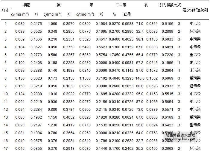 2002年11—12月長春市30個室內(nèi)樣本5項指標(biāo)監(jiān)測數(shù)據(jù)cj(湯紅巖等,2005),以及由式(1)和式(7)計算出的指標(biāo)規(guī)范值x′j如表 11所示.由于樣本1、11~15、26和27的不同指標(biāo)計算得到的規(guī)范值相差較大,因此,在用式(12)計算引力綜合指數(shù)時,需用式(13)對引力指數(shù)值進行加權(quán)計算,其余22個樣本的指標(biāo)視作等權(quán),計算得到各樣本引力綜合指數(shù)值,并根據(jù)表 3中空氣環(huán)境質(zhì)量引力指數(shù)分級標(biāo)準(zhǔn)做出評價結(jié)果(表 11).表中還列出文獻(湯紅巖等,2005)中用層次分析評價法做出的評價結(jié)果.由于文獻(湯紅巖等,2005)中的層次分析評價法將室內(nèi)空氣污染劃分為清潔(1*級)、未污染(2*級)、輕污染(3*級)、中污染(4*級)和重污染(5*級)等5級;而本文引力指數(shù)法將其劃分為1級、2級、3級.二者對應(yīng)關(guān)系為:(1*級清潔、2*級未污染)對應(yīng)1級,(3*級輕污染)對應(yīng)2級,(4*級中污染、5*級重污染)對應(yīng)3級.由表 11可以看出,二種方法評價結(jié)果完全一致.