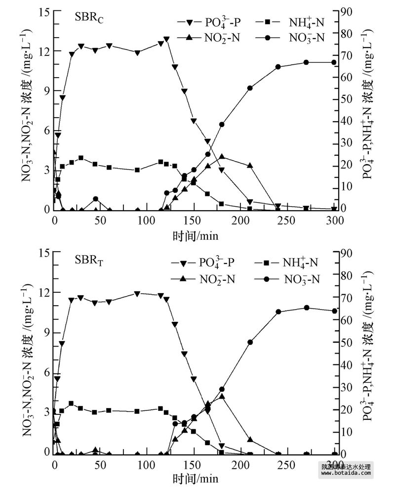 兩套SBR反應器穩(wěn)定運行狀態(tài)下,出水乙酸鈉和亞硝酸鹽濃度低于檢測方法的檢出限,出水PO3-4-P,NH+4-N濃度均小于0.5 mg · L-1,反應器具有良好的脫氮除磷功能;SBRC反應器出水NO-3-N濃度為(12.9±2.2)mg · L-1,SBRT反應器出水NO-3-N濃度為(15.3±2.0)mg · L-1.表明TBBPA對SBR反應器硝化和除磷效率沒有太大影響,但對出水硝態(tài)氮濃度略有影響.