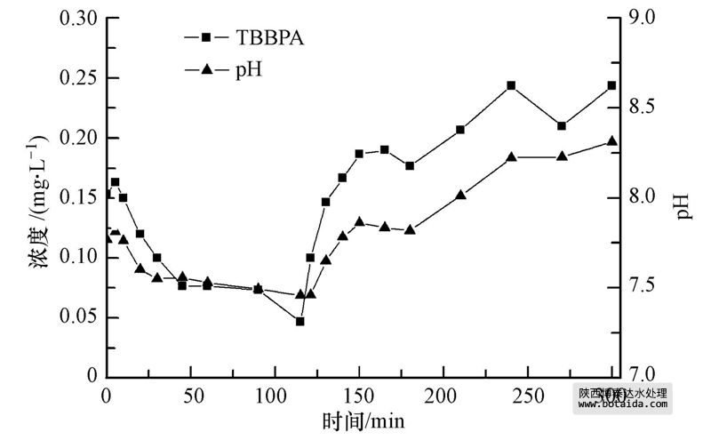 在對SBRT反應周期內TBBPA的濃度和pH進行相關性分析時,TBBPA的濃度跟pH有一定線性相關性,相關系數(shù)r為0.94.由圖 3所示,厭氧階段,由于強化生物除磷攝取有機物等反應,pH有所降低;TBBPA的濃度隨著pH的降低而下降,厭氧結束時TBBPA濃度達到最低0.05 mg · L-1.曝氣開始后,由于曝氣導致二氧化碳等吹脫,pH升高,TBBPA濃度隨著pH的升高而升高.TBBPA隨著pH變化的原因為TBBPA的溶解度受pH影響較大,當pH小于7.5時,TBBPA溶解度很低而主要被活性污泥吸附,而pH增加到8時,TBBPA的溶解度急劇上升,表現(xiàn)為溶液中TBBPA濃度的增加.