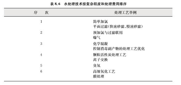 ? 不同水處理工藝按其復雜程度和處理費用的定性排序如表8.6所示,次序越高,工藝或 運營越復雜。