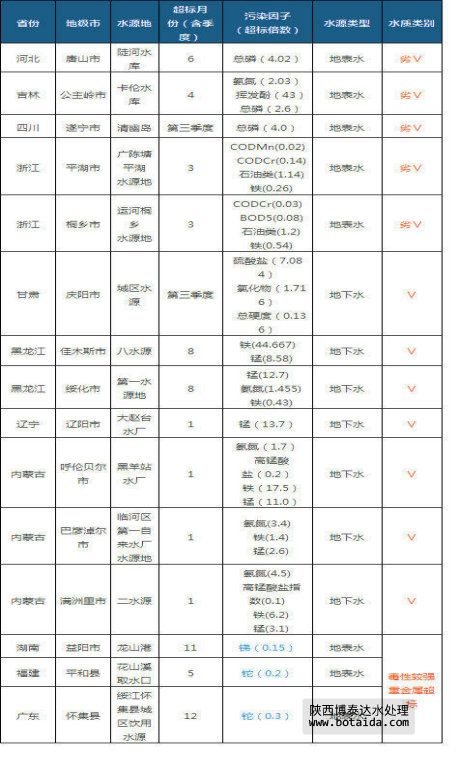 地表水水源地?cái)?shù)量為995個(gè),地下水水源地?cái)?shù)量為338個(gè),雖然地下水水源地?cái)?shù)量只有地表水水源地?cái)?shù)量的1/3,但其超標(biāo)比例卻是后者的3.2倍。平均每個(gè)地下水水源地超標(biāo)6.3次。