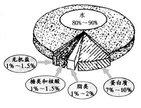 水在細(xì)胞中含量是最多的.在不同種類的生物體中,水的含量差別較大,一般來說,生物體中水的含量為60%~95%.例如,幼嫩植物體中水的含量約為70%,動(dòng)物體中水的含量約為80%左右,水母的身體里水的含量竟約為97%.