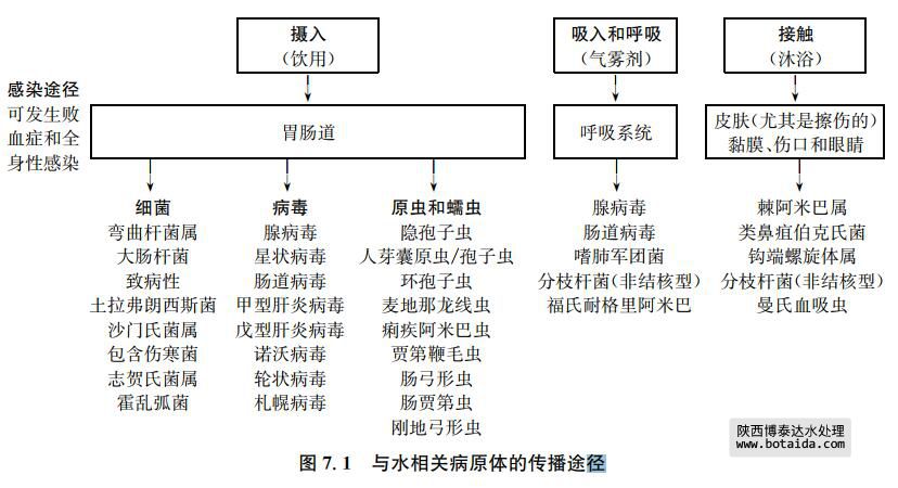 盡管使用被污染飲用水產(chǎn)生的風(fēng)險(xiǎn)最大,但其他傳播途徑也可導(dǎo)致疾病發(fā)生,一些病原 體可通過多種途徑傳播(例如:腺病毒)(見圖7.1)。吸入水滴(氣霧劑)可引發(fā)某些嚴(yán)重疾 病,這是由于水滴中溫度適宜,且有營養(yǎng)物質(zhì)存在,致病微生物可以快速繁殖。這些疾病包 括由軍團(tuán)菌屬引起的軍團(tuán)病,以及由福氏耐格里阿米巴[原發(fā)性阿米巴腦膜腦炎(PAM)]和 棘阿米巴屬(阿米巴腦膜炎,肺部感染)引起的疾病。