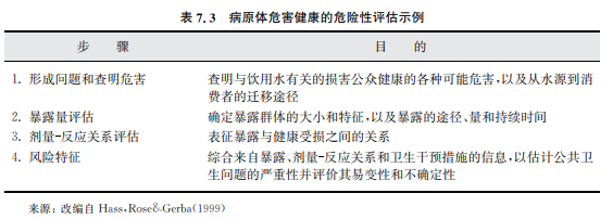 風(fēng)險評估、包括QMRA,首先從提出問題開始,其目的是確定各種可能的危害及危 害從源頭到消費者的各種遷移路徑。然后,將人接觸病原體的情況(環(huán)境濃度及攝入 量)和所選(或參考)生物體的劑量 反應(yīng)關(guān)系綜合起來以描繪出風(fēng)險的特征。結(jié)合其他 信息(社會、文化、政治、經(jīng)濟、環(huán)境等)就可提出一些優(yōu)先選用的管理辦法。為鼓勵利 益相關(guān)各方的支持和參與,在處理過程的每一階段,都能做到透明并主動溝通有關(guān)危險 性的信息是非常重要的。表7.3給出了危險性評估的一個例子并在下面進行詳細(xì) 描述。