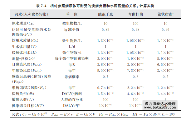 當(dāng)需將一個病例中發(fā)生特定疾病的風(fēng)險轉(zhuǎn)化為疾病負(fù)擔(dān)時,可以使用DALY(metric disabilityadjustedlifeyear)(見第3章3.1)。這不但反映了急性終點反應(yīng)(腹瀉),也反映了 死亡率和更嚴(yán)重的終點反應(yīng)(如與彎曲桿菌有關(guān)的格林 巴利綜合癥,即急性感染性多發(fā)神 經(jīng)炎)。每個病例的疾病負(fù)擔(dān)變化很大。例如,每1000例輪狀病毒的疾病負(fù)擔(dān)在低收入地 區(qū)為480DALYs,而且還經(jīng)常發(fā)生兒童死亡。但在大多數(shù)居民都能得到醫(yī)療救助的高收入 地區(qū)僅為14DALYs/1000例(見附錄1支持性文件《世界衛(wèi)生組織飲用水水質(zhì)準(zhǔn)則中公共 衛(wèi)生風(fēng)險量化》)。由于這種疾病負(fù)擔(dān)上的明顯差別,為了要達到相同的危險程度(以 DALYs/人/年表示),在相同水源質(zhì)量的情況下,在低收入地區(qū)就需要實施更嚴(yán)格的水處 理。表7.4中10-6DALY/人/年這樣的健康結(jié)果目標(biāo)最好能與具體國情相結(jié)合。表7.4中 沒有免疫缺陷人群的計算數(shù)值(如 HIV/AIDS患者中的隱孢子蟲?。?,在某些國家,這些人群的數(shù)量還是很多的。3.2節(jié)中有更多關(guān)于DALY的信息,及關(guān)于如何將其用于獲取風(fēng)險 參考值。