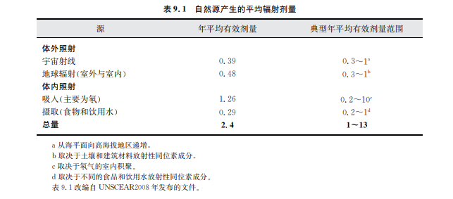 據(jù)聯(lián)合國輻射效應(yīng)科學委員會估計(UNSCEAR,2008),全球每人接受來自環(huán)境中所有 放射源的年平均劑量約為3.0mSv/年(物理量解釋見專欄9.1)。其中,80%(2.4mSv)來自 自然源,19.6%(接近0.6mSv)來自醫(yī)療診斷輻射,而剩下的0.4%(約0.01mSv)來自于其 他人工源(見圖9.1)。對于整個人群,每個人所接受的輻射劑量變化很大,取決于居住地點、 飲食規(guī)律和生活方式等因素。個人輻射劑量也可能因醫(yī)療暴露和職業(yè)暴露而不同。表9.1 列出了年平均劑量和天然來源個人輻照劑量的典型范圍(UNSCEAR,2008)。