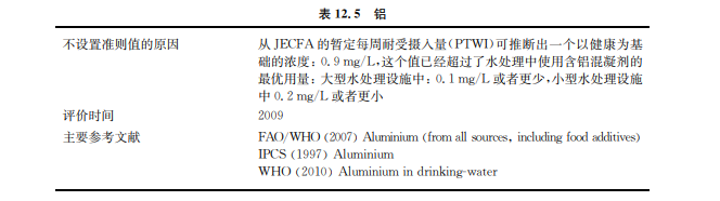 盡管鋁廣泛存在于食物、飲用水及抗酸劑中,很少有跡象表明經(jīng)口攝入鋁會引起人急性 中毒。有一種假設(shè)認(rèn)為鋁的攝入會增加人類老年癡呆癥發(fā)病風(fēng)險。1997年 WHO發(fā)布的 環(huán)境健康標(biāo)準(zhǔn)中對鋁作出規(guī)定(見表12.5)。