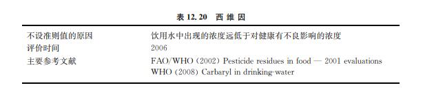 西維因通過抑制腦膽堿酯酶活性發(fā)揮作用,這也是其主要的毒性模式。不過,西維因也 被認為是一種小鼠體內會引起雄性小鼠血管瘤的非基因毒性致癌物。在此基礎上,JMPR 設定犃犇犐為0~0.008mg/kgbw,這一犃犇犐通過15mg/kgbw/d的最低損害作用水平 (LOAEL)以及采用安全系數(shù)為2000(種間變異為10,種內變異為10,不確定系數(shù)另?。保?用來反映罕見惡性腫瘤的出現(xiàn))計算而得。 假定一個60kg的成年人每天飲用2L水,飲用水的攝入配額假設為20%,從0~ 0.008mg/kgbw的犃犇犐值可以確定以健康為基準的準則值為50μg/L(取整值)。不過,似 乎在飲用水中沒有發(fā)現(xiàn)高濃度西維因,因此認為沒有必要提出一個正式的準則值。